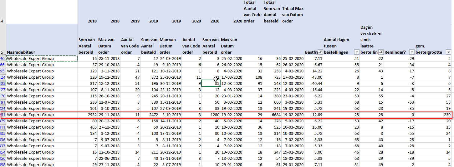 Op basis van de extrapolatie van het bestelgedrag uit het verleden hebben we een query gemaakt die na bewerking in excel leidt tot een bestelreminder voor de klant. Dit kan je groothandel helpen om samen met de klant te bepalen of voorraden moeten worden aangevuld teneinde de continuïteit van het bedrijfsproces van de klant te garanderen.